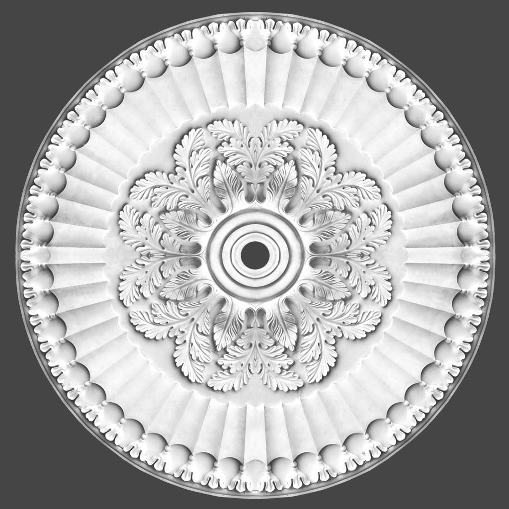 Эта лепная гипсовая розетка оформлена стилизованными листьями болотника вытянутой формы - тема, уходящая корнями в искусство Древней Греции. Не смотря на наличие орнамента практически по всей плоскости изделия, за счёт тонкой деталировки оно выглядит изящным и не перегруженным декором.